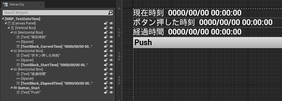まずは UE4.27 で経過時間を表示する実装をしてみましょう。 Widget Blueprint を作成し、下記図のように Widget を配置します。