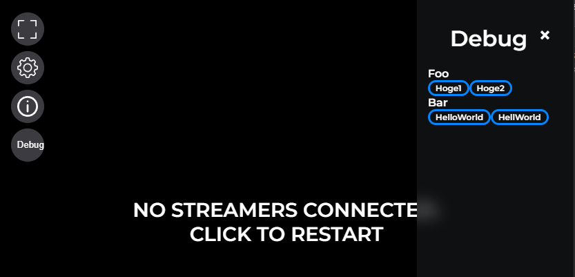 this.stream.emitUIInteraction("FooBar");のように書けます。 - 左端のボタンをクリックすると、右側に設定パネルが表示される仕組みになっているので、同様にデバッグボタンを新設し、これをクリックするとデバッグパネルが開くようにします。 DataChannel のイベントを送るテスト用のボタンはこのデバッグパネルの中に並べていきます。