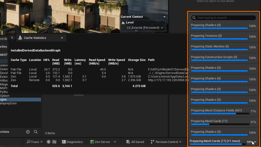 HillsideサンプルでローカルZenServer・リモートZenServer・UnrealCloudDDCを有効にした時のキャッシュ状況はこんな感じになりました。