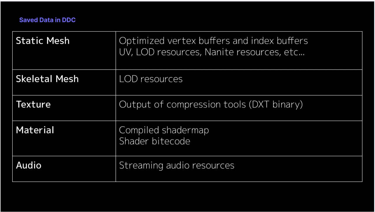 Unreal Fest Gold Coast 2024 の講演Improving Development Iterations: A Deep Dive into Enhanced Feature のスライドに、DDCに保存されるデータの内容が記載されています。