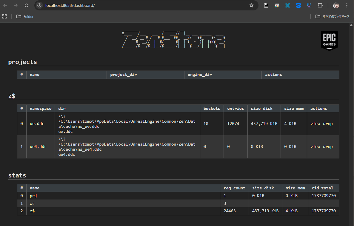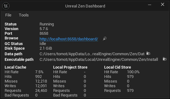 UEエディタの右下にあるZenServerのアイコンをクリックして、Launch Dashboard を表示すると、ローカルのZenServerの状態が表示されます。